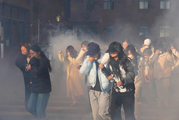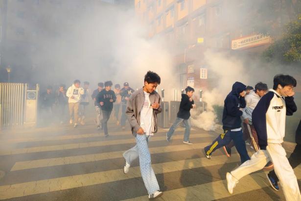 活动现场,学生们捂住口鼻,弯腰低姿,沿指定楼梯成两路纵队迅速下行。整个过程紧张有序,没有出现拥挤、推搡现象。疏散过程中,各区域负责人沉着指挥,合理控制疏散进度,确保安全。